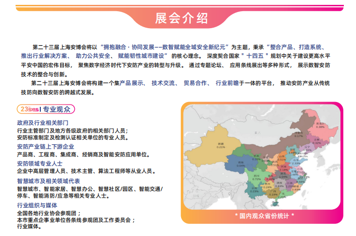 展品范圍出入口控制 道閘、伸縮門、路障、讀卡器、警報(bào)器、平開門、車牌識(shí)別、人臉識(shí)別、懸開門等門禁 門禁一體機(jī)、開放式門禁、嵌入式門禁、門禁控制器、考勤門禁系統(tǒng)、讀卡器、一卡通、門禁電控鎖、閉門器、電子貓眼門鈴、無線對(duì)講門鈴、可視門鈴等防盜報(bào)警 智能安防及報(bào)警呼救系統(tǒng)、探測器及附件、報(bào)警主機(jī)、控制軟件、總線傳輸與控制、聯(lián)動(dòng)控制、無線報(bào)警、警衛(wèi)中心等生物識(shí)別 指紋識(shí)別技術(shù)、靜脈識(shí)別技術(shù)、掌紋識(shí)別技術(shù)、面部識(shí)別技術(shù)、虹膜識(shí)別技術(shù)、語音識(shí)別技術(shù)等監(jiān)控系統(tǒng)等 前端設(shè)備、視頻傳輸設(shè)備、視頻交換和處理、視頻顯示設(shè)備、視頻聯(lián)網(wǎng)解決方案、系統(tǒng)監(jiān)控系統(tǒng)后臺(tái)高端應(yīng)用、監(jiān)控系統(tǒng)的外部接口及聯(lián)動(dòng)、社區(qū)安防等電子鎖 電子門鎖、智能卡門鎖、IC卡鎖、TM卡鎖、射頻卡鎖、感應(yīng)鎖、指紋鎖、數(shù)碼鎖、音控鎖、磁卡鎖、門吸鎖、各種生物識(shí)別鎖等樓字對(duì)講 物聯(lián)網(wǎng)可視對(duì)講系統(tǒng)、門口主機(jī)、室內(nèi)分機(jī)、管理中心機(jī)、中間設(shè)備等公共安全 防范綜合管理平臺(tái)、視頻監(jiān)控、防盜報(bào)警、出入口、電子巡查、人臉識(shí)別、一卡通系統(tǒng)、安防線纜、機(jī)柜、周界安防以及電子圍欄、智能引導(dǎo)及停車場管理系統(tǒng)、存儲(chǔ)設(shè)備等智能照明及設(shè)備 住宅照明、陳列照明、舞臺(tái)照明、智能照明、聲控?zé)艄狻踩珶簟⒕o急燈、節(jié)能燈、其它特殊照明、電器控制元器件、電光源、變壓器、穩(wěn)壓器、穩(wěn)壓調(diào)壓器等智慧家庭 物聯(lián)網(wǎng)基礎(chǔ)設(shè)施、全屋智能、智能家電、智能控制、智能門鎖、智能健康、智能通訊等