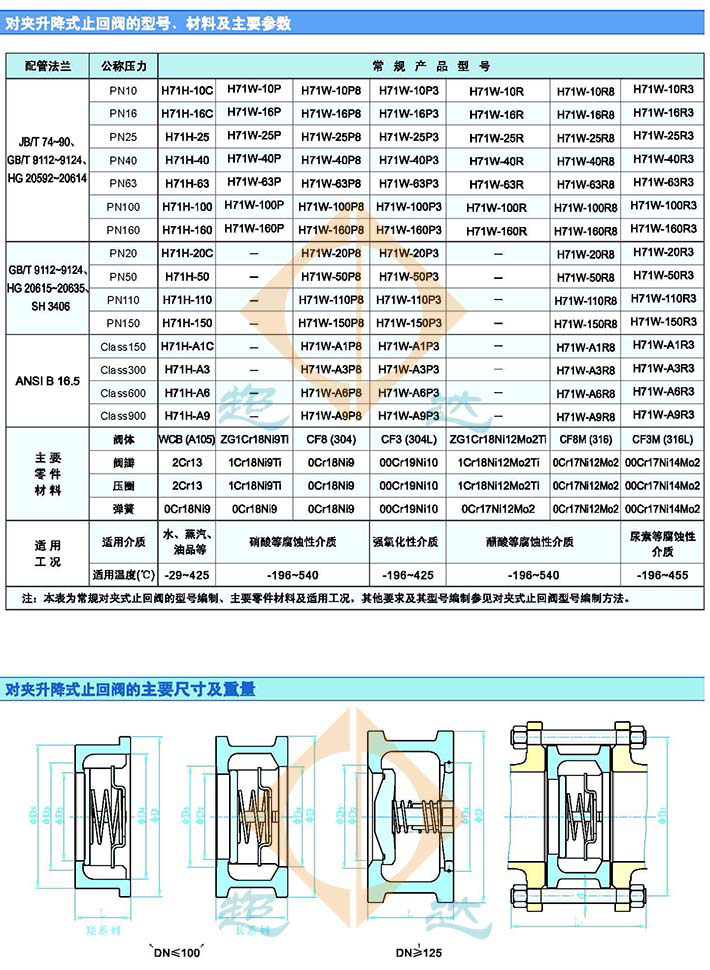 超達集團專業研制生產H71對夾式止回閥等閥門產品,超達生產的H71對夾式止回閥具有產品體積小、重量輕、動作靈敏、密封可靠、安裝方便等特點。H71對夾升降式止回閥由閥體、閥瓣及彈簧組成,采用對夾連接。由于對夾升降式止回閥的閥瓣的關閉行程短,具有彈簧預加載,避免產生水錘現象。H71對夾式止回閥似于墊片一樣被對夾在兩片法蘭之間,沒有螺栓孔,一般選擇H71對夾式止回閥的比較多,H71對夾式止回閥便宜,安裝所需空間小。